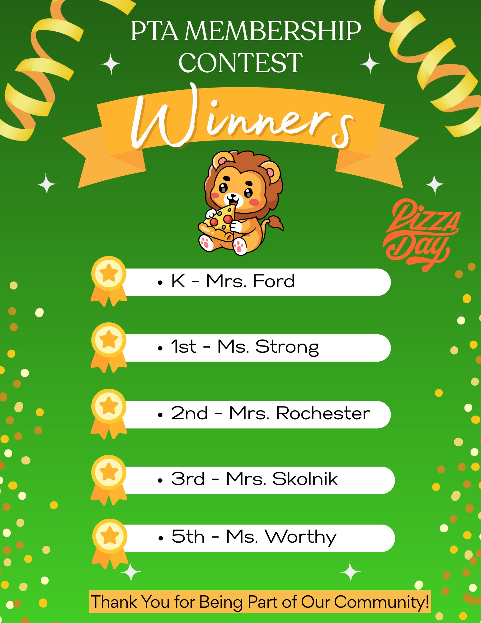 Congratualtios Congratulations to all the winners! PERMISSION SLIPS WILL BE COMING SOON. PIZZE PARTY WINNERS: Kindergarten = Ford 1st Grade = Strong 2nd Grade = Rochester 3rd Grade = Skolnik. . .